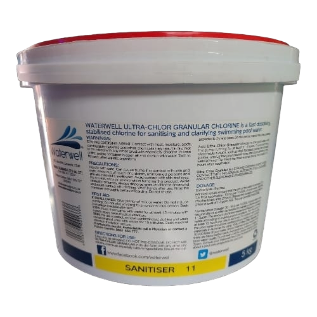 Waterwell Ultra-Chlor 5KG Granular Chlorine is the new standard in swimming pool sanitation. Specially formulated for long-lasting protection, this high-efficiency chlorine ensures your water remains sparkling clear, safe, and inviting — even under harsh summer sun.