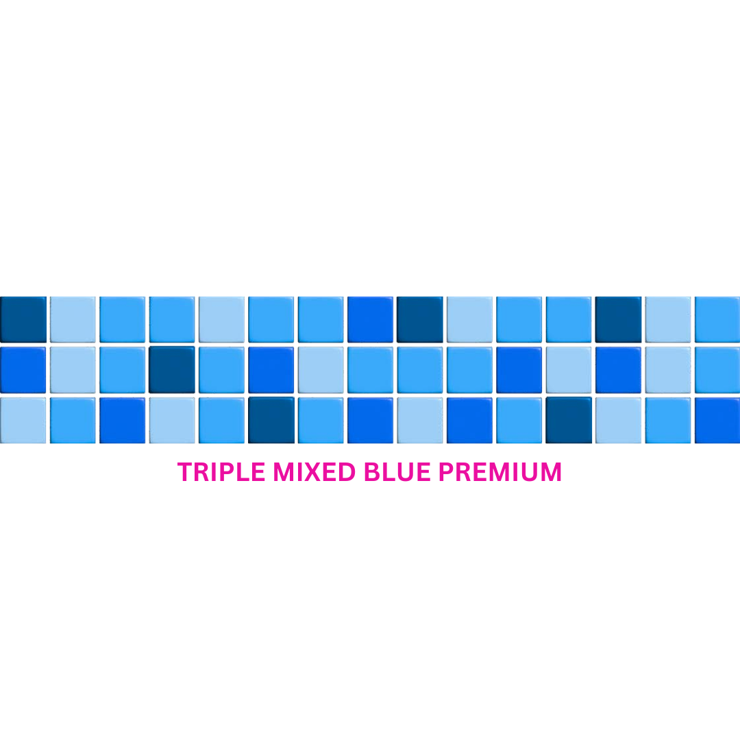 The POOL MOSAIC TRIPLE MIXED BLUE PREMIUM (800mm × 160mm) is a digitally printed, fibreglass-only mosaic strip that brings a vibrant mix of blue tones to your pool. Designed for seamless integration during lamination, it eliminates the hassle of grout lines, cracked tiles, and fading colours.