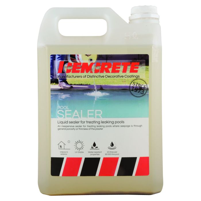 The Cemcrete Pool Sealer Liquid (5L) is an affordable and effective solution for treating leaking pools caused by general porosity or thinness in the pool plaster. This sealer works by being added directly to the pool water, eliminating the need to empty the pool. While it effectively addresses seepage through the plaster, it is not designed to seal plumbing leaks or structural cracks.