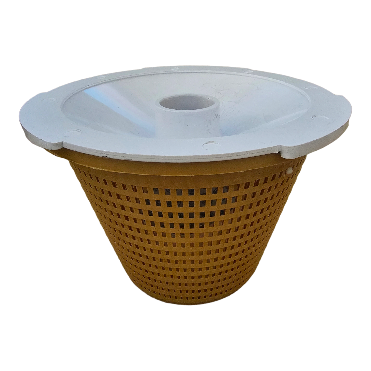 A standard pool weir/skimmer basket available in MUSTARD. These baskets are a quick and easy replacement to ensure the optimum function of your pool. The suction line of the skimmer is also used to clean the pool. A hose vacuum or in pool vacuum machine are often hooked up to a skimmer line to clean out small debris like sand, dirt, and some leaves. The basket includes a rope handle. Fits the SWIMQUIP WHITE WEIR VAC LID, Fits a large weir. Size: 17 cm diameter (top) x 13 cm (height) x 12,7 cm diameter (bottom)